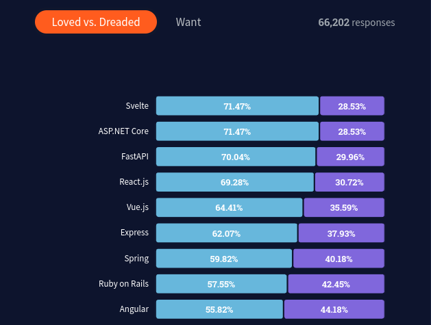 Svelte is the most loved framework, and for good reason. Svelte places strong emphasis on developer happiness because it's so easy to pick up and has a compiler that is more efficient than its peers.